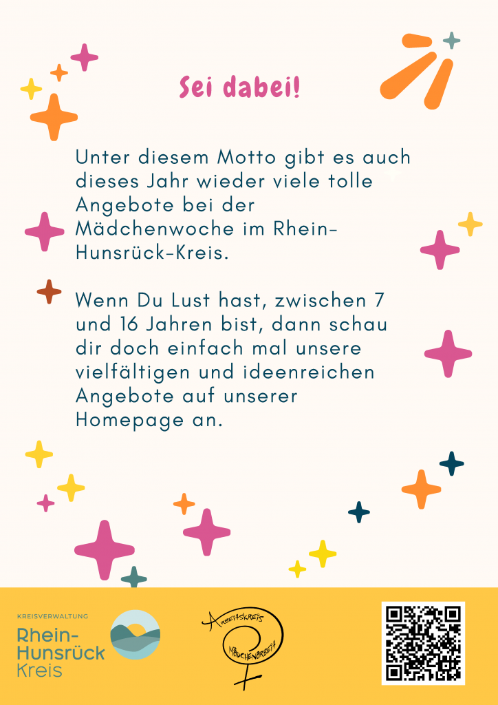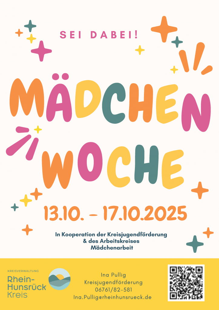 Vom 13. bis 17. Oktober 2025 lädt die Kreisjugendförderung gemeinsam mit dem Arbeitskreis Mädchenarbeit wieder zur Mädchenwoche ein. In dieser Aktionswoche können Mädchen Neues ausprobieren, ihre Stärken entdecken und Selbstvertrauen entwickeln – von kreativen Workshops über spannende Ausflüge bis hin zu Angeboten zur Selbstbehauptung.