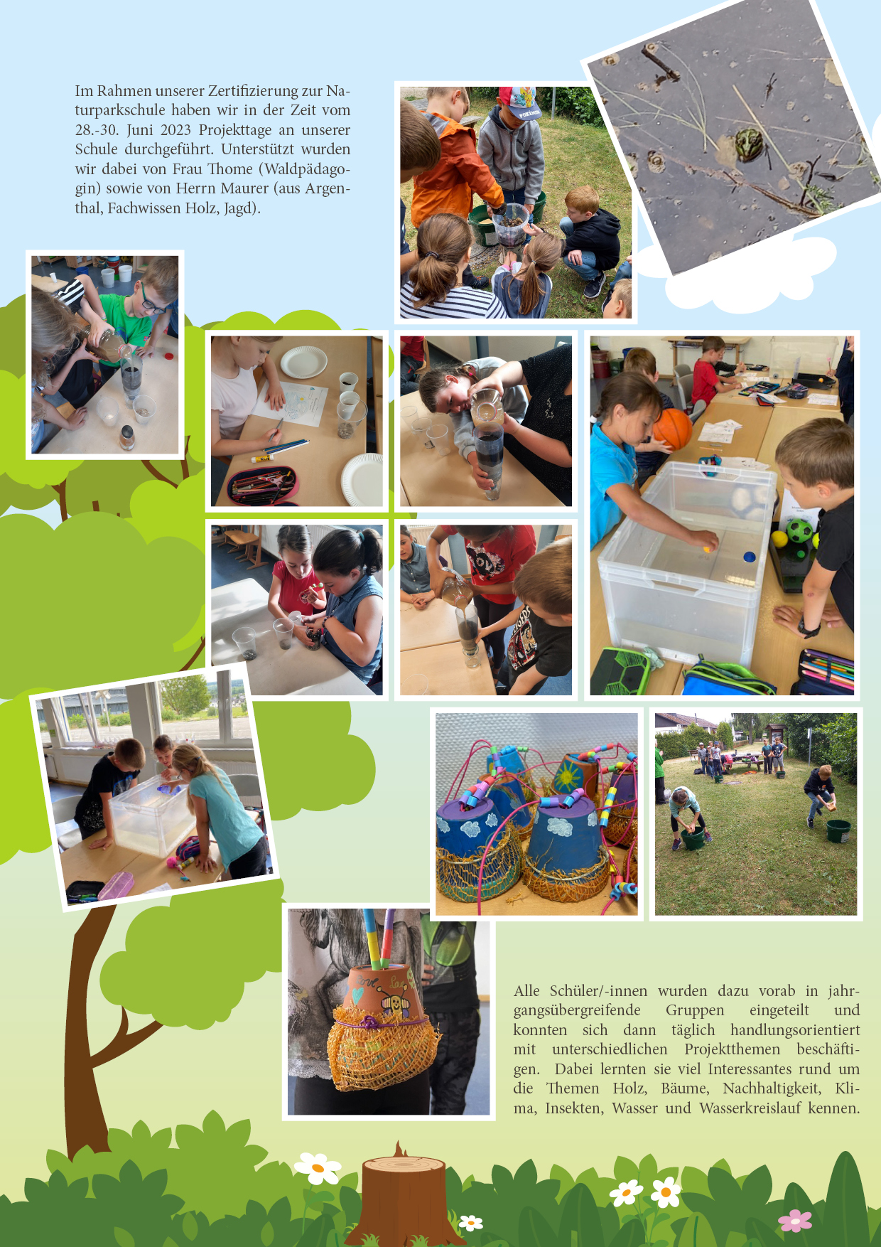Am Freitag, den 5.7.2024 wurde unsere Schule im Rahmen eines Schulfestes offiziell zur Naturparkschule zertifiziert. Nach einem offiziellen Teil wurde uns eine Urkunde von Herrn Boch und Herrn Boos überreicht. Auch Vertreter/-innen des Naturparks waren anwesend, Hr. Rohr, Fr. Dietrich und Fr. Krafft. Im Anschluss haben wir 2 Apfelbäumchen neben der Schule gepflanzt, die uns an diesen schönen Tag erinnern sollen und deren Wachstum unsere Schüler/-innen beobachten können. Hoffentlich tragen sie reichlich Früchte, was wir uns auch als Naturparkschule für unsere Kinder wünschen: Erfahrungen in der Natur sammeln, Beziehungen zu unserer Heimat entwickeln und sie dafür sensibilisieren, diese zu pflegen, achten und wert zu schätzen. „Was ich schätze-schütze ich“ soll mehr als ein Motto werden.